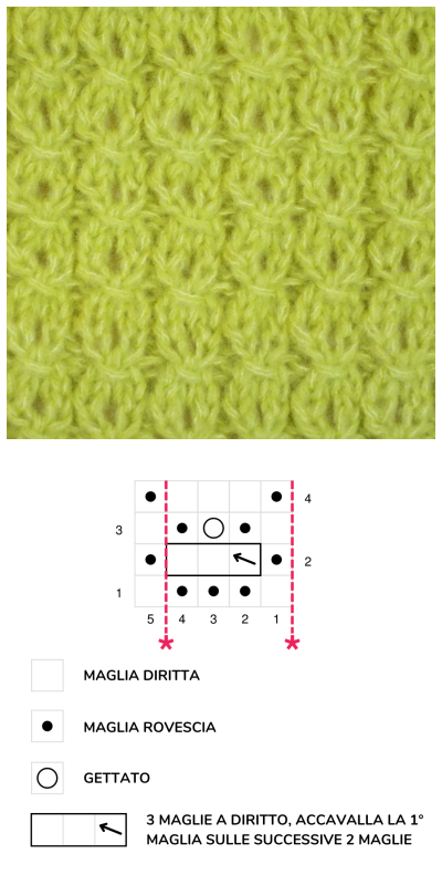 3° ferro: 1 maglia di vivagno, 1 maglia a diritto, *1 maglia a rovescio, 1 gettato, 1 maglia a rovescio, 1 maglia a diritto*.