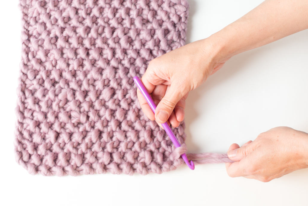 Per realizzare delle frange macramè di 30 cm circa, tagliare dei fili lunghi 150 cm ciascuno. Piegarli a metà e farli passare, con l’aiuto di un uncinetto, nelle maglie in modo da formare un cappio.