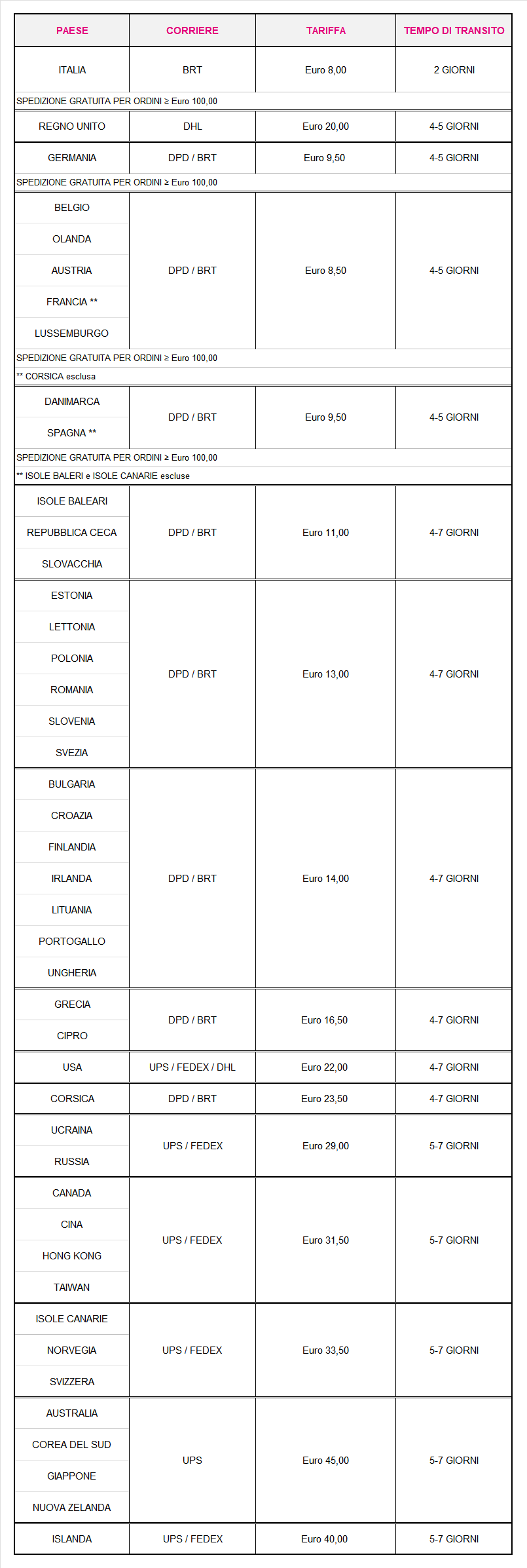 Se l’importo del tuo acquisto raggiunge la soglia dei indicata in tabella, avrai diritto alla Spedizione Gratuita.